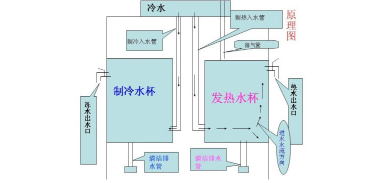 1.直冷式冷熱飲水機(jī)由水箱提供常溫水,進(jìn)水分兩路:一路進(jìn)入冷膽容器,經(jīng)制冷出冷水;另一路進(jìn)入熱罐,經(jīng)加熱出熱水。
